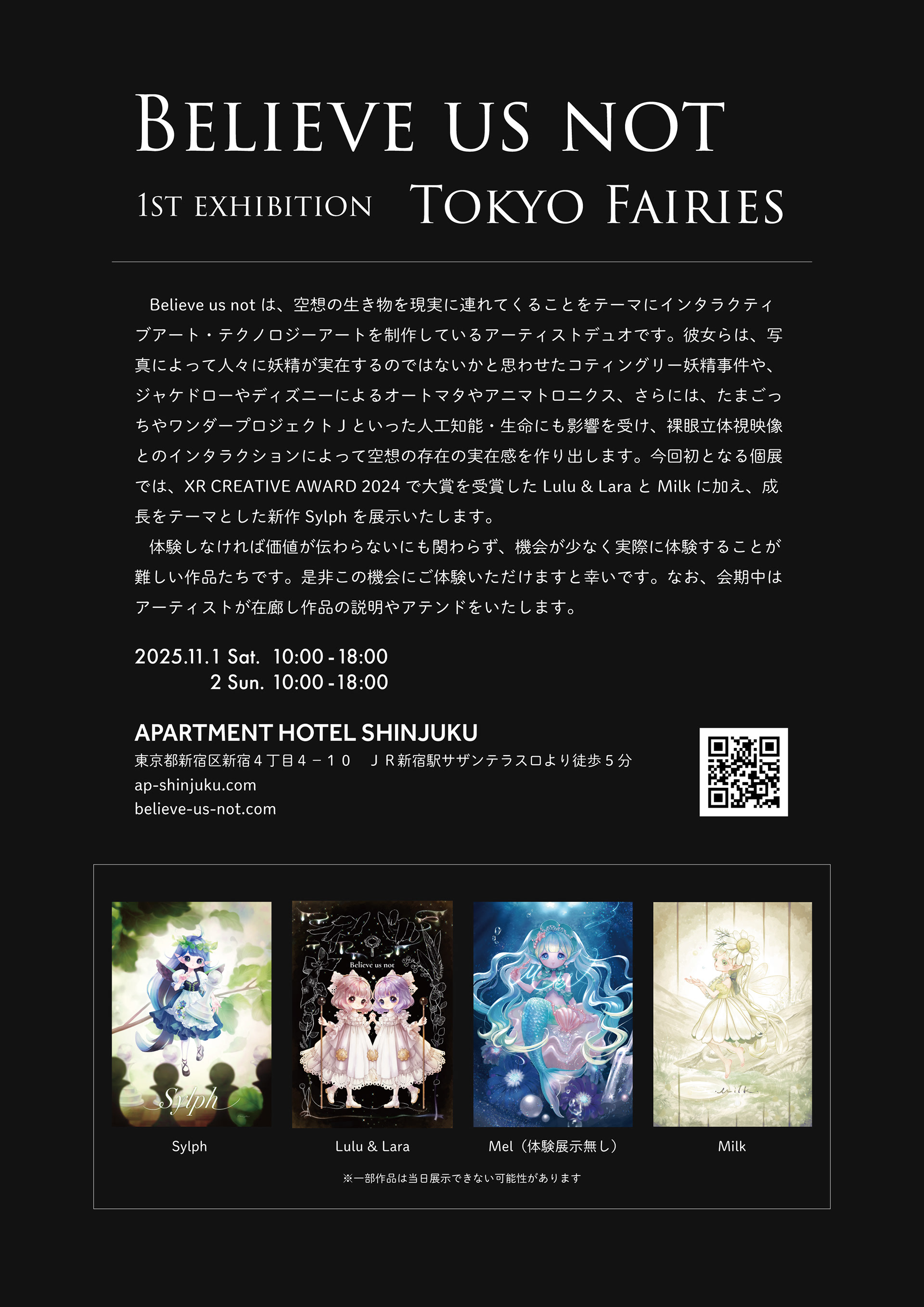 Believe us not は 2025年11月1日(土)と2日(日)10:00~18:00 に APARTMENT HOTEL SHINJUKU にて、初の個展となる Tokyo Fairies を開催いたします。